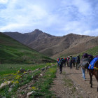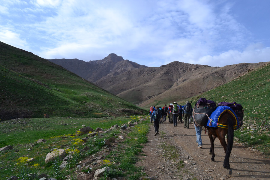 In the morning, enjoy a three hour tour of the old city, taking in some of the palaces and markets, travelling part of the way by ‘caleche’ (horse and carriage). After a good lunch in Marrakech and some final shopping for provisions in the souk, you will transfer by bus to Oukaimeden, where there are superb views back across the plains towards Marrakech. Situated at about 2,700 metres, here you will find flat, green valleys with sandstone boulders, on some of which can be found pre-historic rock engravings. You will spend the night in a chalet refuge before embarking upon your trek tomorrow morning.